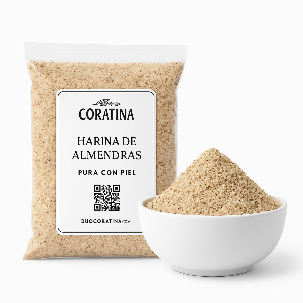 Una harina fina y nutritiva, elaborada únicamente con almendras molidas, sin añadidos ni conservantes. Está elaborada a partir de almendras enteras (con piel), lo que le da un color ligeramente más oscuro y una textura más granulada, lo hace ideal para recetas donde se desea una textura más rica y densa.