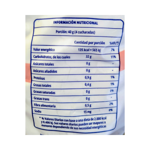Ingredientes: Fécula de maíz, harina de arroz, Fecula de mandioca, Pyllium Husk, Polvo de hornear, EA12, E471