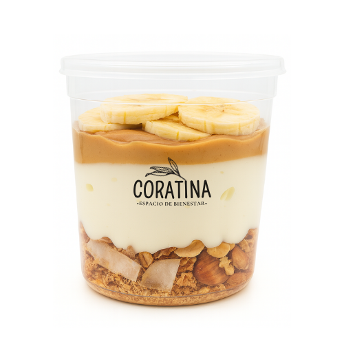 Yogur natural con Whey proteín sabor vainilla + pasta de maní + granola coco love + topping de banana