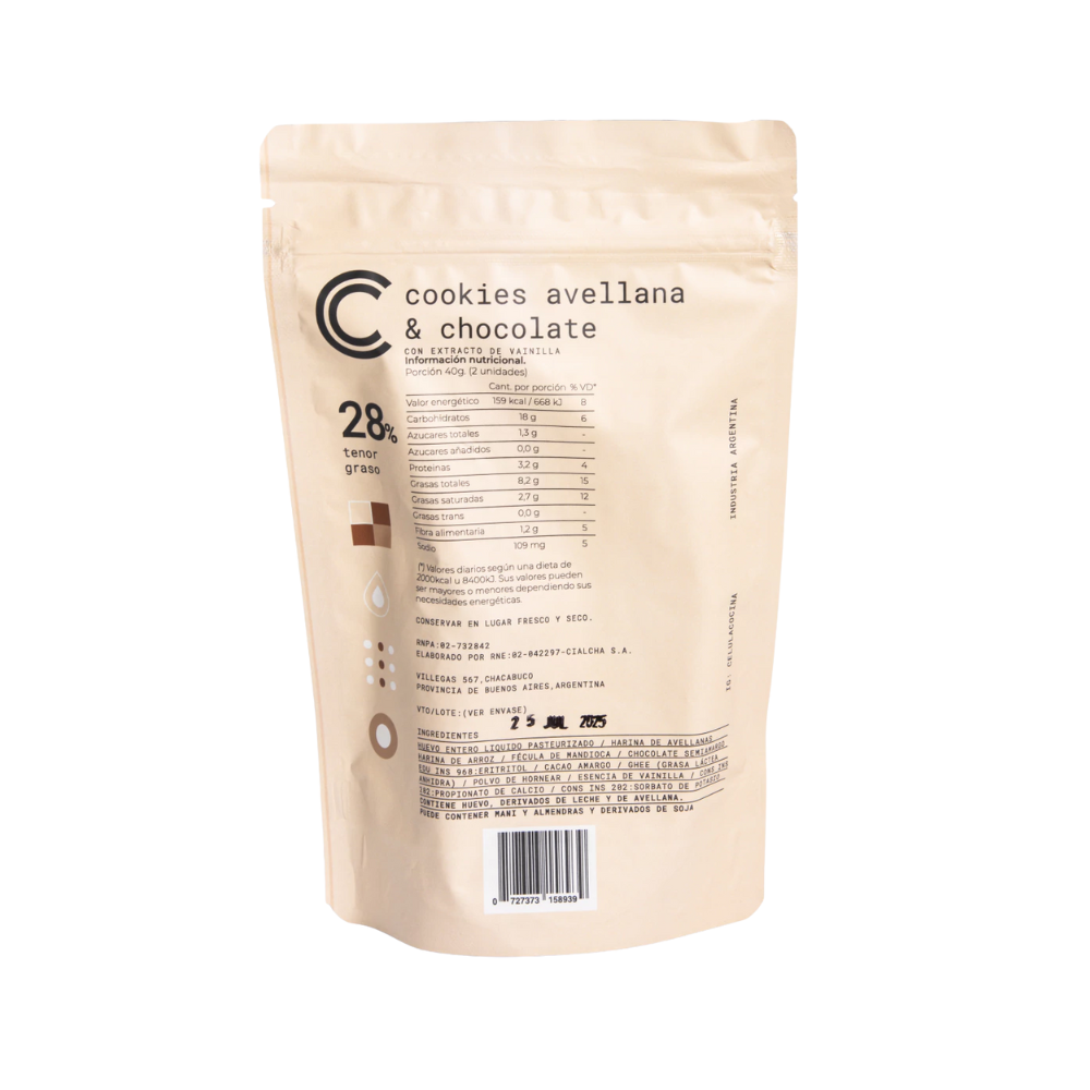 🌰 Avellana & Choco: con huevo, harina de avellana, harina de arroz, fécula de mandioca, chocolate amargo 73%, eritritol, cacao amargo, ghee, polvo de hornear y vainilla.