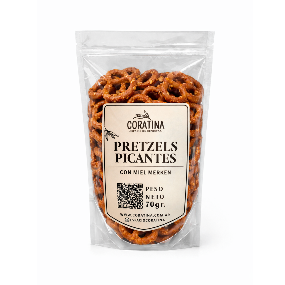 Una combinación irresistible de crocante, dulce y picante. Pretzels horneados bañados con miel y un toque de merkén ahumado que aporta profundidad, aroma y un picor justo. Un snack distinto, intenso y adictivo.