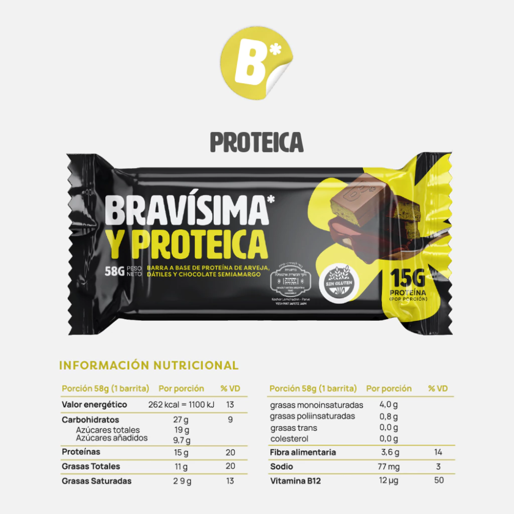 Barra elaborada a base de proteína de arveja, dátiles naturales y chocolate semiamargo, una combinación equilibrada que aporta energía y proteínas de origen vegetal, ideal para sumar a tu alimentación diaria.