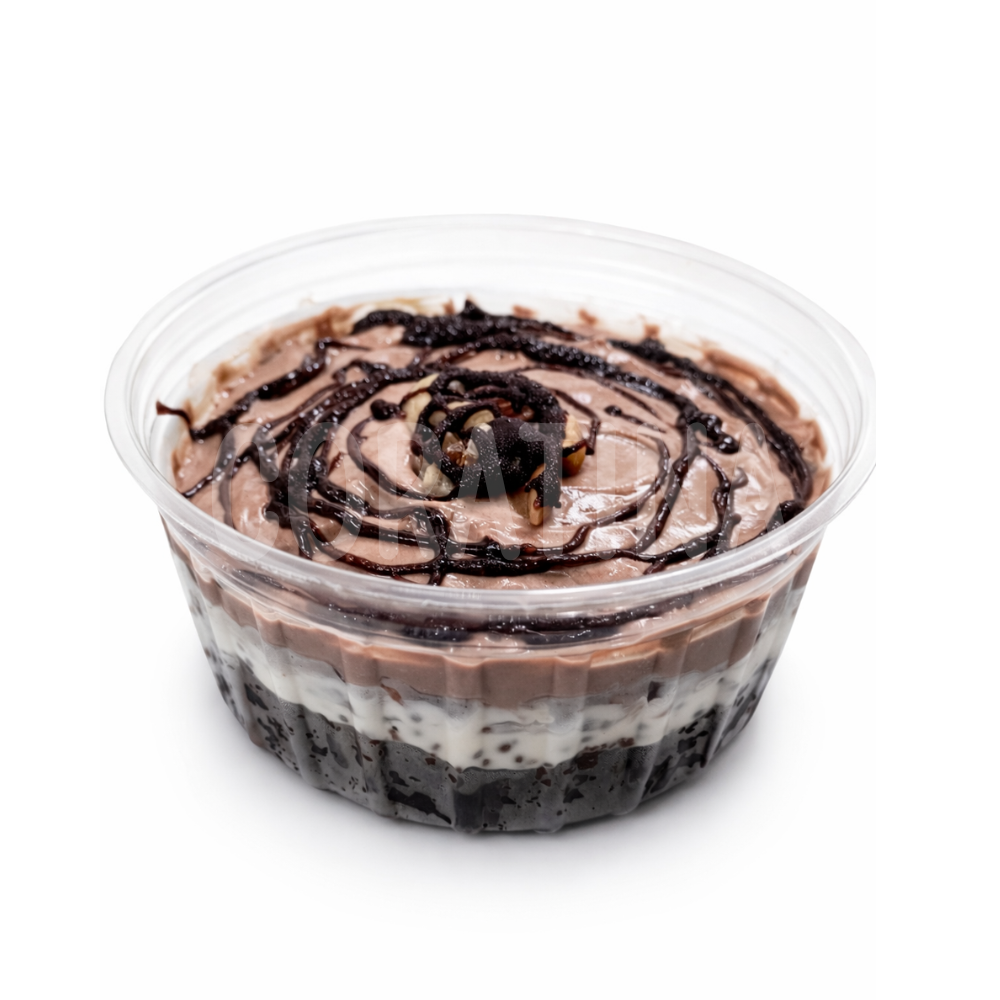 Postre artesanal elaborado sin harina y sin azúcar, con una base de tortita de lentejas, una capa cremosa de yogur griego con chía, combinada con frutos rojos o frutos secos, y una cobertura final de yogur griego con cacao amargo. Una opción equilibrada, nutritiva y deliciosa.