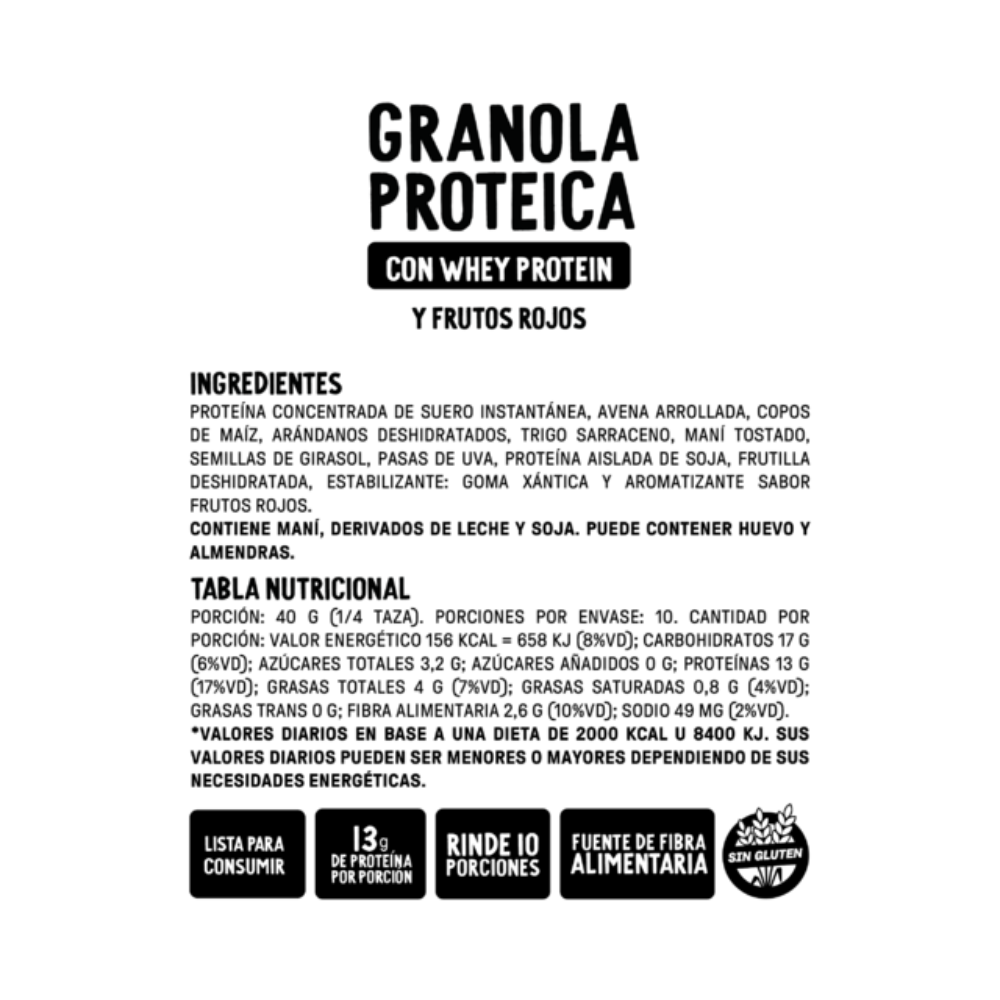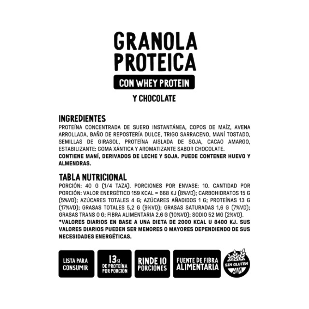 Una granola práctica, nutritiva y llena de energía. Con alto contenido de proteínas y fuente de fibra alimentaria, es ideal para acompañar tu desayuno, merienda o como colación rápida y saludable.