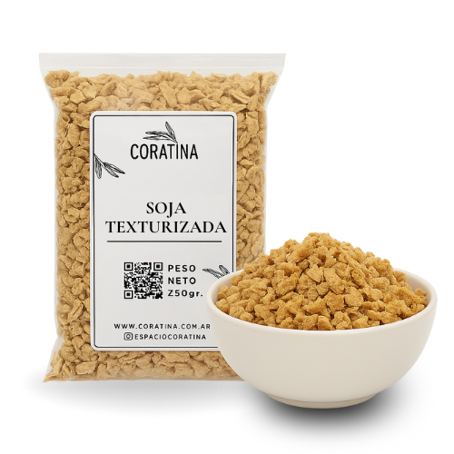 Es un derivado de la harina de soja desgrasada y procesada. Una excelente fuente de proteína vegetal, ideal para reemplazar la carne en preparaciones saladas. De textura esponjosa y neutra, se hidrata fácilmente y absorbe los sabores que elijas. Perfecta para una cocina práctica, económica y saludable.